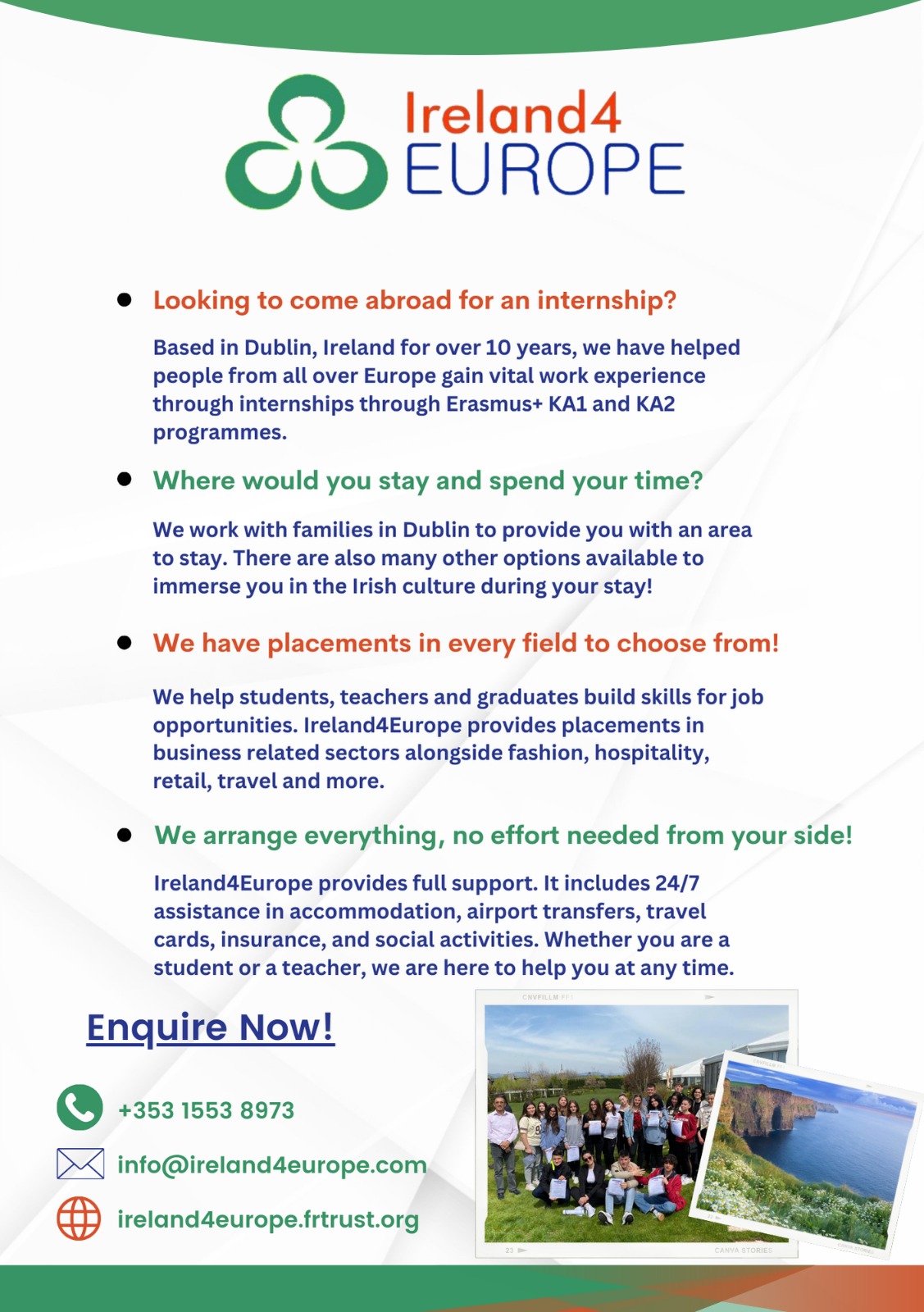 Take the next step in shaping your future! Explore exciting Erasmus+ opportunities with Ireland4Europe and gain invaluable experience, skills, and cultural exposure. Don't miss out—contact us today to start your journey!